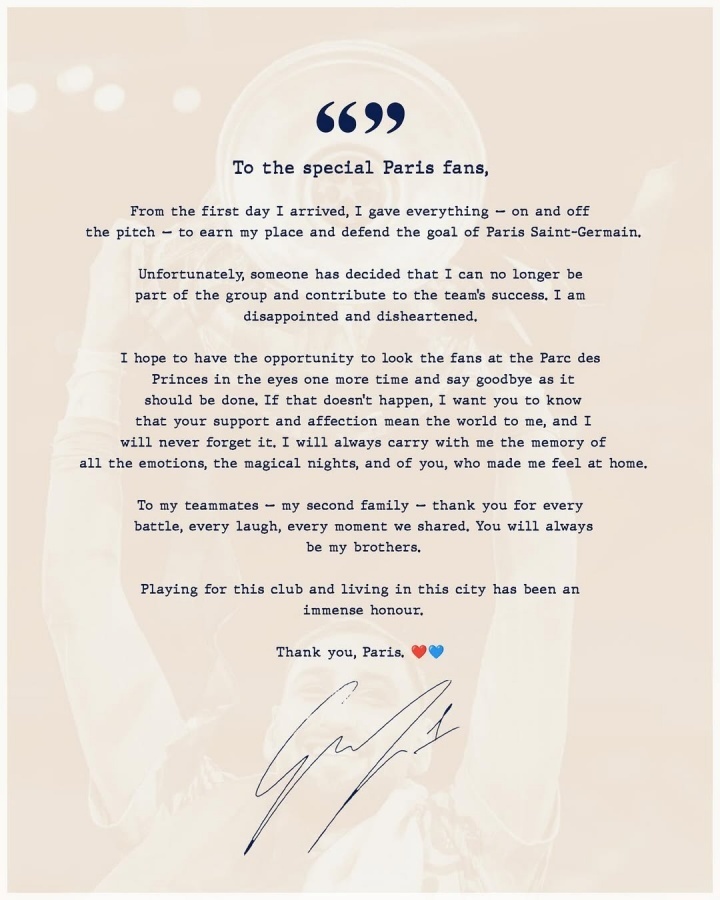 多纳鲁马在信中谈到巴黎是自己第二个家,对于自己的队友们都非常的尊重、认可、欣赏,只不过,他很难继续再与这支队伍打拼了。按照多纳鲁马发布的声明来看转会在即,这也跟外界给出的预计是相契合的。